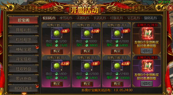 (1)限时达标:开服前四天共八种达标,等级,战宠,青龙,白虎,朱雀,玄武,强化,诛邪。每天两种,并伴有珍宝阁出售对应所需材料。
