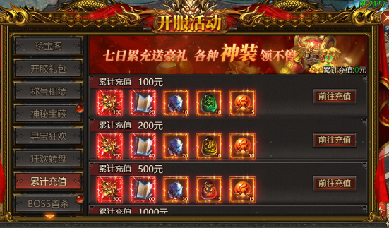 (3)累计累充:开服七天内累计充值达到对应档位可领取丰厚奖励